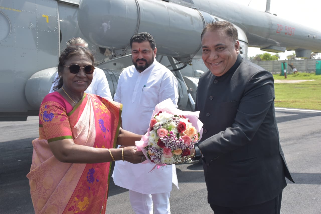 હેલિપોર્ટ ખાતે પ્રવાસન મંત્રી શ્રી મૂળુભાઈ બેરા, સાંસદ શ્રી રાજેશભાઈ ચુડાસમા, કલેક્ટર શ્રી એન.વી.ઉપાધ્યાય અને જિલ્લા પોલીસવડા શ્રી જયદિપસિંહ જાડેજાએ રાષ્ટ્રપતિશ્રીને પુષ્પગુચ્છ આપી આવકાર્યા હતાં.