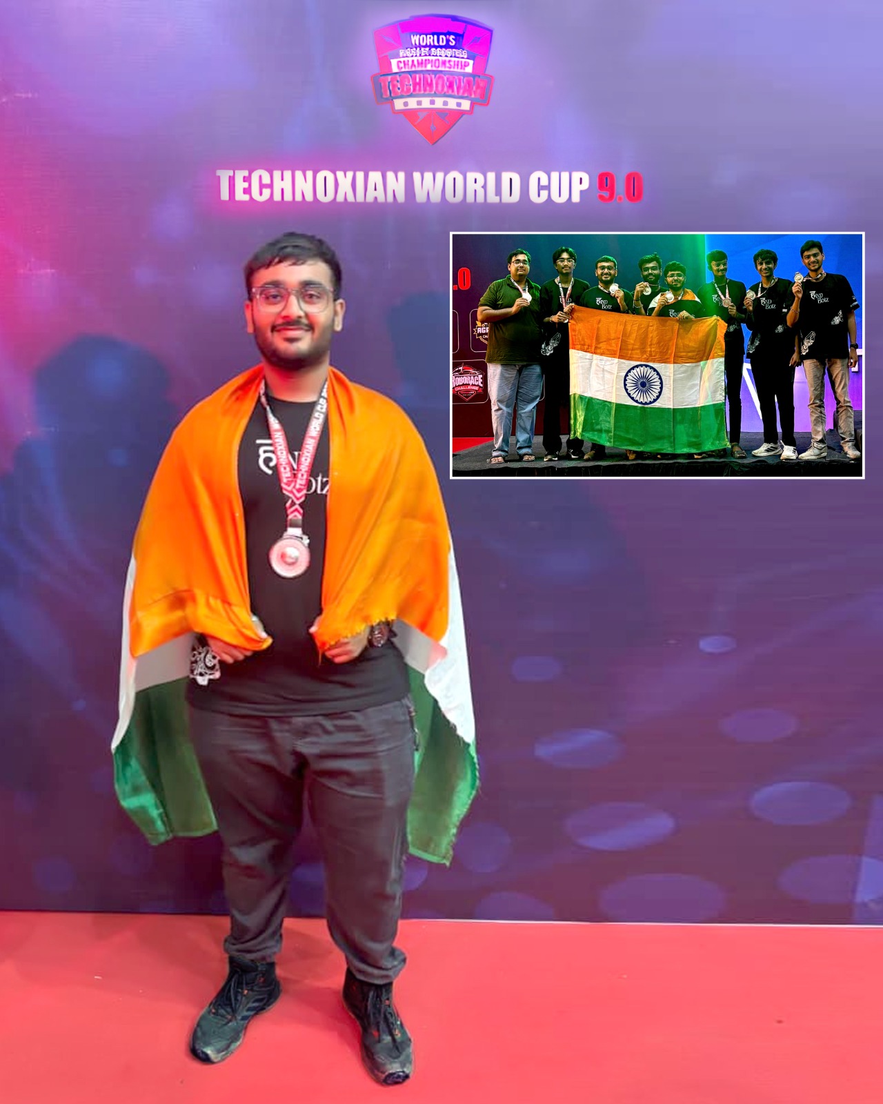 Cyborgs robotics club ના પ્રેસિડેન્ટ MOKSH VAKHARIYA તથા તેમની ટીમ ના સભ્યો એ Technoxian World Cup ઐતિહાસિક સફળતાનવી દિલ્હી ખાતે યોજાયેલા Technoxian World Cup આંતરરાષ્ટ્રીય સ્તરના પ્રતિષ્ઠિત રોબોટિક્સ સ્પર્ધા યોજયેલ જેમા Cyborgs Robotics Club ના સભ્યોએ ગૌરવપૂર્ણ સફળતા પ્રાપ્ત કરી છે.