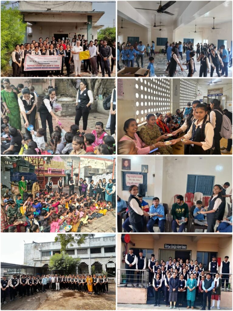 બી.એસ.ડબલ્યુ. સેમેસ્ટર-૬ના વિદ્યાર્થીઓએ પ્રોફેસર નીતા દુધરેજીયાના માર્ગદર્શન હેઠળ શિશુકુંજ સંસ્થામાં બાળકો સાથે બાળગીતો, વાર્તાઓ, રમતો અને નાસ્તા-સ્ટેશનરીનું વિતરણ કર્યું હતું.