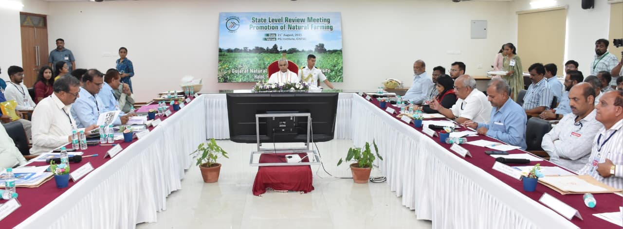 ગુજરાતમાં પ્રાકૃતિક કૃષિ સંદર્ભે રાજ્યભરમાં થઈ રહેલી કામગીરી અને પરિસ્થિતિની સમીક્ષા કરવા તથા પ્રાકૃતિક કૃષિનો વ્યાપ વધારવા અર્થે રાજ્યપાલશ્રી આચાર્ય દેવવ્રતજીના અધ્યક્ષસ્થાને પંચમહાલ જિલ્લાના હાલોલ સ્થિત ગુજરાત નેચરલ ફાર્મિંગ સાયન્સ યુનિવર્સિટી ખાતે રાજ્યકક્ષાની સમીક્ષા બેઠક યોજાઇ હતી.