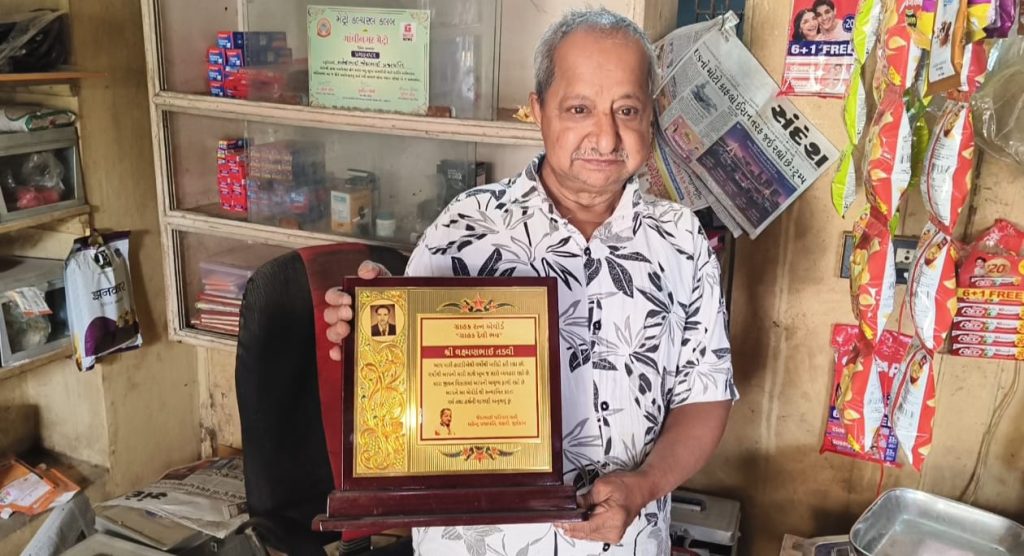 નર્મદાના માંગરોળ ગામે આવેલ અનાજ કરિયાણાની નાનકડી દુકાન ચલાવતા ગાંધીવાદી વિચારસરણી ધરાવતા મહેન્દ્રભાઈ પ્રજાપતિને ત્યાં છેલ્લા 40 વર્ષથી લક્ષ્મણ તડવી નામનો નિયમિત કાયમી આદર્શ ગ્રાહક બન્યો છે. જે અત્યંત પ્રામાણિક અને વિશ્વાસુ ગ્રાહક તરીકે 40 વર્ષથી એક ધારા ગ્રાહક બની દુકાનદાર તરીકે પ્રેમનો નાતો બંધાયો છે. જેના અનુસંધાને આજે મહેન્દ્ર કાકાએ આ ગ્રાહકનું ખાસ વિશેષ અનોખું સન્માન કર્યું હતું. ગ્રાહક લક્ષ્મણ તડવીને શાલ, ઓઢાડી,ટ્રોફી આપી 5000/-રોકડ રકમઆપી ગ્રામજનો અને ગ્રાહકો