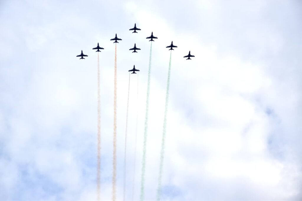 • ભારતીય વાયુસેનાના નવ વિમાનો દ્વારા ઓપરેશન સૂર્યકિરણ એર શોનું અદ્દભુત પ્રદર્શન રજુ કર્યું હતું. નવ ઝાંબાજ પાયલોટોની ટીમે આકાશી કરતબો રજૂ કરી સરદાર સાહેબને આકાશી સેલ્યુટ આપી હતી.