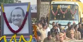 અજિત પવારની અંતિમ યાત્રા તેમના કાટેવાડી નિવાસસ્થાનથી શરૂ થઈ ગઈ છે, અને તેમને સંપૂર્ણ રાજ્ય સન્માન સાથે અંતિમ વિદાય આપવામાં આવી રહી છેઅજિત પવારની અંતિમ યાત્રા તેમના કાટેવાડી નિવાસસ્થાનથી શરૂ થઈ ગઈ છે, અને તેમને સંપૂર્ણ રાજ્ય સન્માન સાથે અંતિમ વિદાય આપવામાં આવી રહી છે. શોભાયાત્રા લગભગ 6 કિલોમીટરનું અંતર કાપ્યા પછી ટૂંક સમયમાં સ્મશાનભૂમિ પહોંચશે. શોભાયાત્રા સાથે રહેલા સમર્થકોએ “અજીત દાદા અમર રહે!” ના નારા લગાવ્યા. પોતાના નેતાને અંતિમ શ્રદ્ધાંજલિ આપવા માટે સમર્થકોની મોટી ભીડ એકઠી થઈ હતી. આંસુભરી આંખો સાથે લોકોએ અજિત પવારને અંતિમ વિદાય આપી રહ્યા છે.