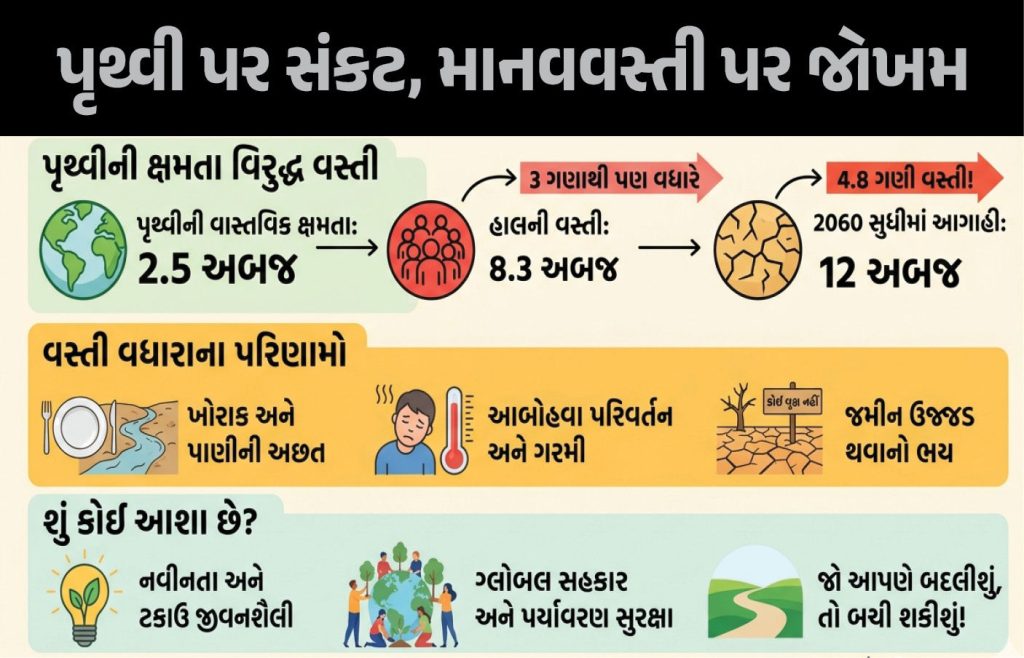 પૃથ્વીની વાસ્તવિક ક્ષમતા (Sustainable Limit): જો આપણે પર્યાવરણને નુકસાન પહોંચાડ્યા વિના સલામત અને સ્વસ્થ જીવન જીવવું હોય તો પૃથ્વી માત્ર 2.5 અબજ લોકોને જ ટકાવી શકે એમ છે.