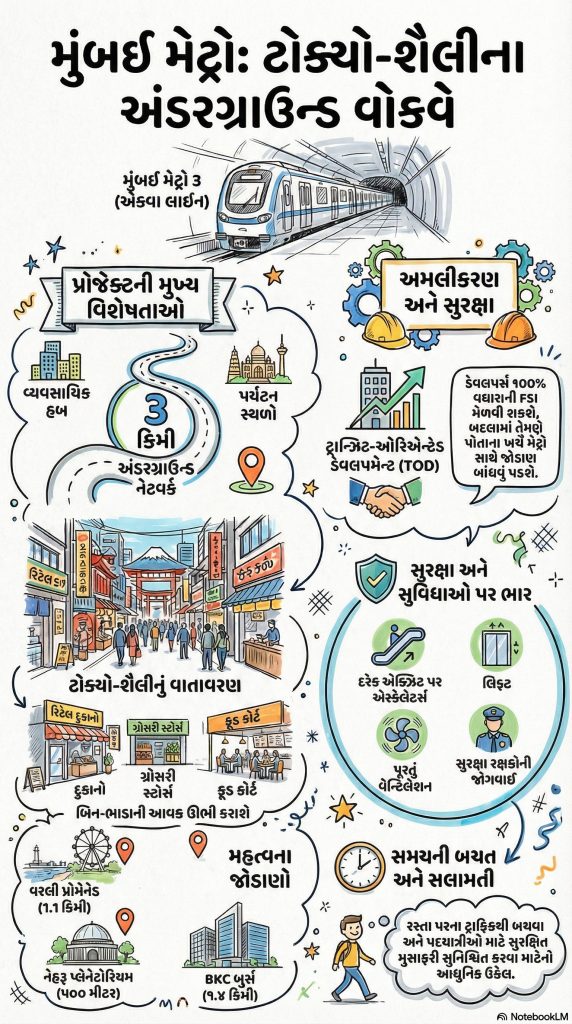 મુંબઈની લાઇફલાઇન ગણાતી મેટ્રો 3 (Aqua Line) હવે માત્ર મુસાફરી પૂરતી મર્યાદિત નહીં રહે, પરંતુ પદયાત્રીઓ માટે એક આધુનિક અંડરગ્રાઉન્ડ ઇન્ફ્રાસ્ટ્રક્ચર પૂરું પાડશે. મુંબઈ મેટ્રો રેલ કોર્પોરેશન (MMRCL) દ્વારા BKC અને સાયન્સ સેન્ટર જેવા સ્ટેશનોથી ઑફિસ કોમ્પ્લેક્સ અને પ્રવાસન સ્થળોને જોડવા માટે અંદાજે 3 કિમી લાંબુ ટનલ નેટવર્ક બનાવવાની યોજના તૈયાર કરવામાં આવી છે.