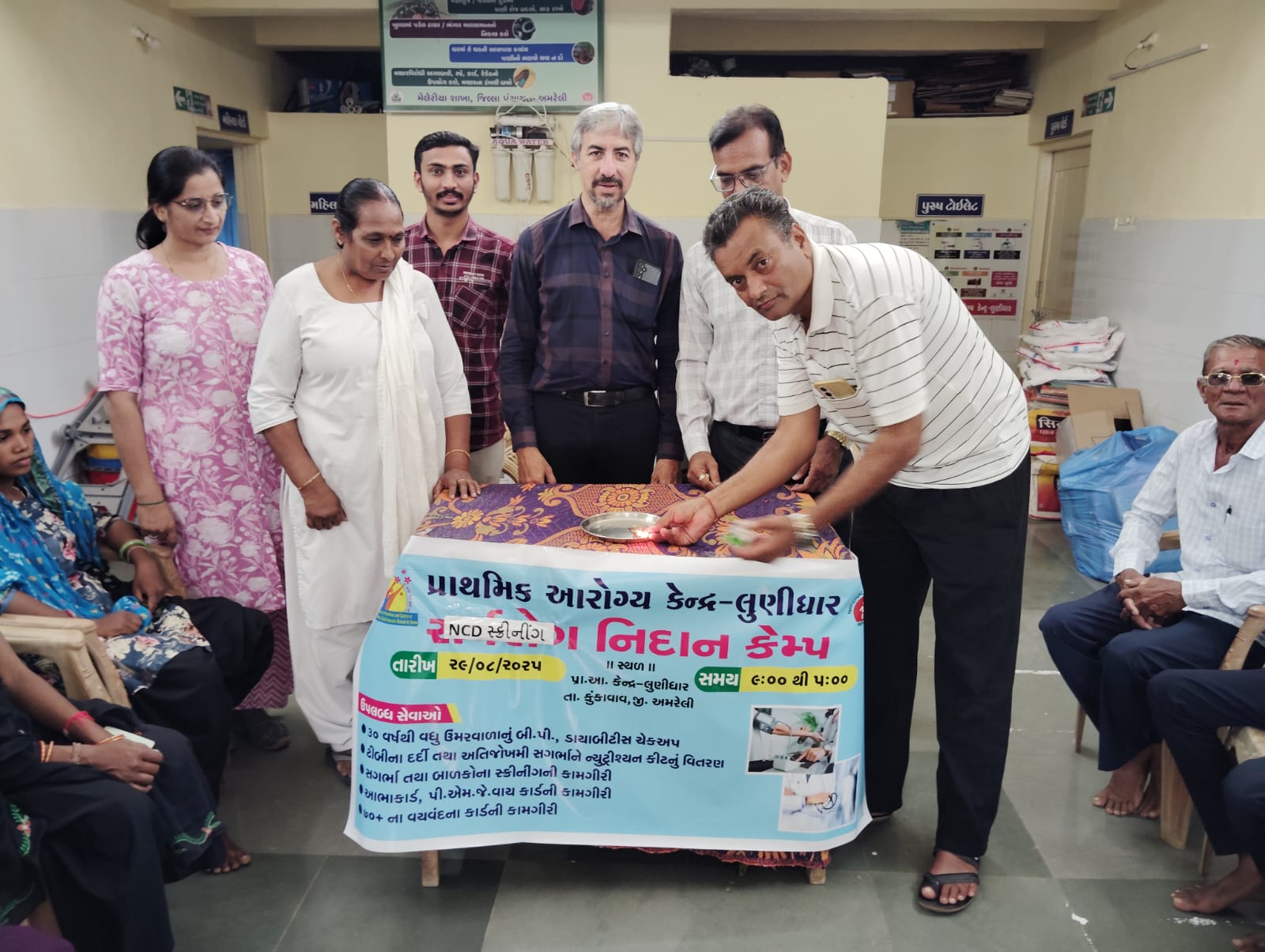 અમરેલી જલ્લાના કુકાવાવના લુણીધાર પ્રાથમિક આરોગ્ય કેન્દ્ર ખાતે જિલ્લા આરોગ્ય અધિકારી સાહેબ ની સુચના મુજબ તાલુકા આરોગ્ય અધિકારીશ્રી ડો . બલદાણિયા ના માર્ગદર્શન હેઠળ લુણીધાર ગ્રામ પંચાયત સભ્ય શ્રી દિનેશભાઈ સરધારા ના હસ્તે દીપ પ્રાગટ્ય કરી NCD સ્ક્રીનીંગ નિદાન કેમ્પ નું ઉદઘાટન કરવામાં આવેલ.