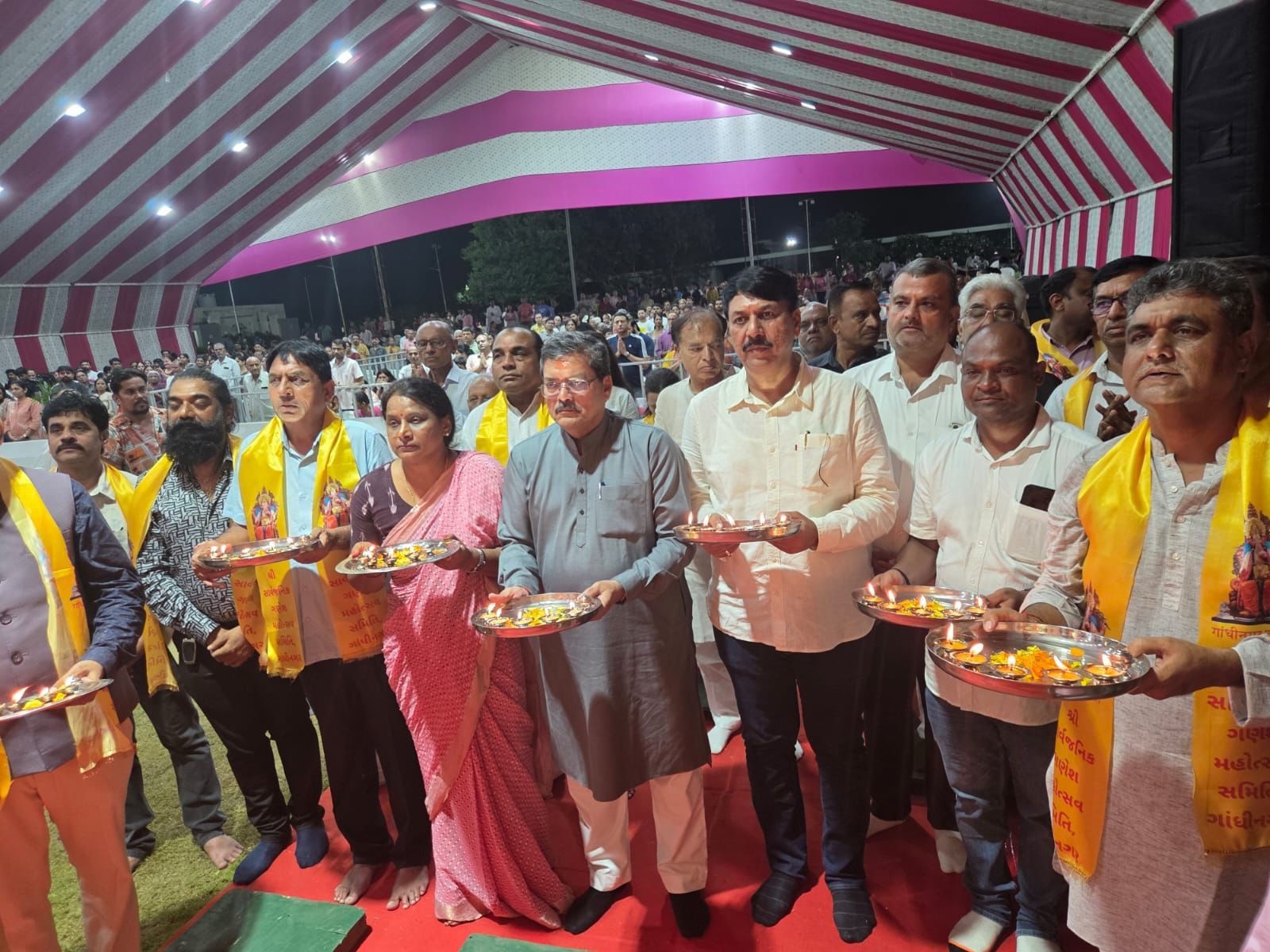 શ્રી સાર્વજનીક ગણેશોત્સવ સમિતિ ના અધ્યક્ષ શ્રી નિશિત ભાઈ વ્યાસ દ્વારા તેમનું સ્વાગત કરાયું હતું તેમજ અન્ય જિલ્લા તથા શહેર સમિતિ ના હોદ્દેદારો સાથે અનુસૂચિત સમાજ ના અગ્રણી શ્રી ચીમનભાઈ વિંઝુડા,શ્રી મયુરભાઈ મહેતા, શ્રીમતિ ધર્મિષ્ઠા બેન મકવાણા,શ્રી ગૌતમભાઈ સોલંકી, સાથે શહેર તથા હુસૈની કમિટીના આગેવાન સર્વ શ્રી યુનુસભાઈ પરમાર, શ્રી દરિયાખાન સિપાહી,શ્રી હનીફ શેખ અને ગાંધીનગર નાગરિક કો.ઓ.બેંક ના ચેરમેન શ્રી મહેન્દ્રભાઈ પટેલ (દાસભાઈ) તથા અર્બન કો. ઓપ. બેંક ના ચેરમેન શ્રી ચંદુભાઈ એચ. પટેલ તથા ડિરેક્ટર શ્રી ઉરેનભાઈ એલ.પટેલ, શ્રી સાકાભાઈ જે.પટેલ, શ્રી ભરતભાઇ એન. પટેલ, શ્રી જયંતિ ભાઈ ડાભી ઉપસ્થિત રહ્યા હતા. સમિતિ દ્વારા સૌ મહેમાનો નું સ્વાગત કરવામાં આવ્યું હતું.