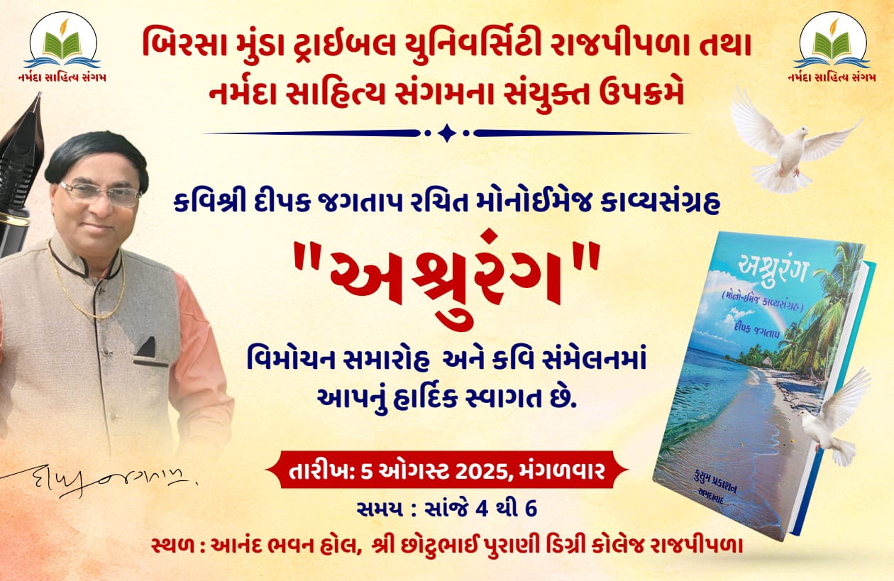 રાજપીપલા ખાતે બિરસા મુંડા ટ્રાઇબલ યુનિવર્સિટી રાજપીપળા તથા નર્મદા સાહિત્ય સંગમના સંયુક્ત ઉપક્રમે સાહિત્યકાર કવિ શ્રી દીપક જગતાપના મોનોઇમેજ કાવ્યસંગ્રહ “અશ્રુરંગ “ના વિમોચન સમારોહ અને કવિ સંમેલન કાર્યક્રમઆનંદ ભવન હોલ, શ્રી છોટુભાઈ પુરાણી ડિગ્રી કોલેજ રાજપીપળા ખાતે તારીખ 5 ઓગસ્ટ 2025, મંગળવારના રોજ સાંજે 4 થી 6 ક્લાકે યોજાશે.