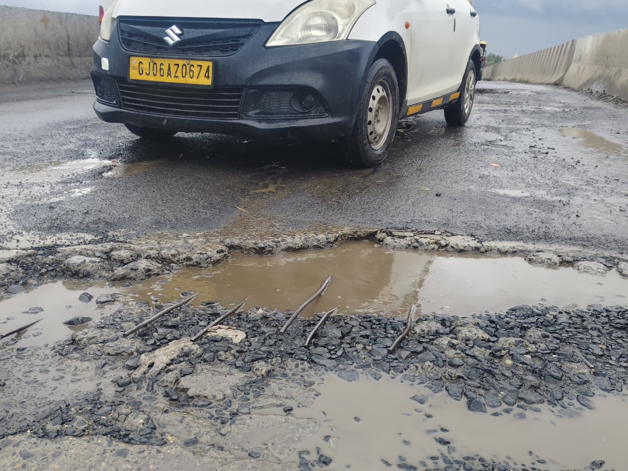 ડભોઇ સરિતા રેલ્વે ઓવર બ્રિજ પર થોડાક જ વરસાદમાં ફરી રોડ ઉપર આઠમી વખતે સળિયા દેખાવા લાગ્યા ટુ વ્હીલર તાલુકો ની ગાડીમાં ફસાઈ રહ્યા છે