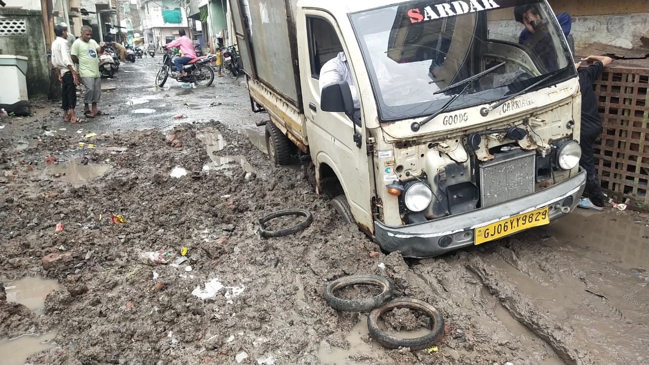 ડભોઇ શહેરના મહુડી ભાગોળ થી સુંદર કુવા રોડ પર ખાડા પડી ગયા હોય આજે સવારે એક ટેમ્પો ફસાઈ જતા માર મુસીબત સે બહાર કાઢવામાં આવ્યો હતો