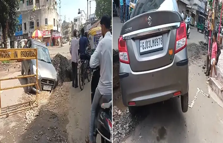VADODARA : શહેરના જયરત્ન ચારરસ્તા પાસે કોર્પોરેશને ખોદેલા ખાડામાં કાર ફસાઈ