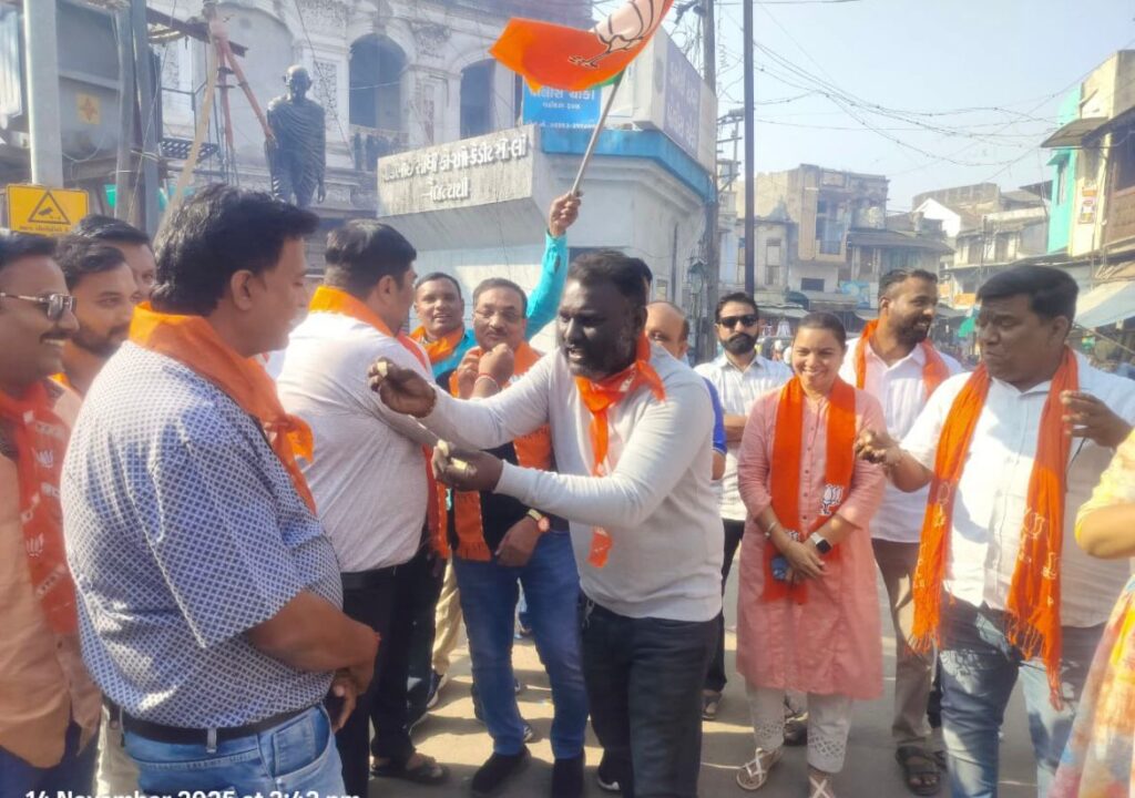 ડભોઇ ભારતીય જનતા પાર્ટી દ્વારા બિહારમાં ભાજપ-એનડીએની ઐતિહાસિક જીત ની ભવ્ય ઉજવણી ડભોઇ ટાવર ચોક ફટાકડા ફોડીને આકાશ બાજી કરી અને જીતની ઉજવણી કરવામાં આવી બિહાર વિધાનસભા ચૂંટણીના પરિણામોએ રાજ્યમાં રાજકીય સમીકરણો બદલી નાખ્યા છે. ભારતીય જનતા પાર્ટી અને એનડીએ ગઠબંધનએ પ્રચંડ બહુમતી સાથે ઐતિહાસિક જીત નોંધાવી છે. મતદાતાઓએ વિકાસ, સુશાસન અને સ્થિરતાના મુદ્દાઓને પ્રાથમિકતા આપીને એનડીએ પર ભરોસો વ્યક્ત કર્યો છે.ભાજપે ઘણા બેઠકો પર રેકોર્ડ તોડ પ્રદર્શન કર્યું છે, જ્યારે સાથી દળોએ પણ મજબૂત પ્રદર્શન સાથે ગઠબંધનને વધુ સુદૃઢ બનાવ્યું છે.