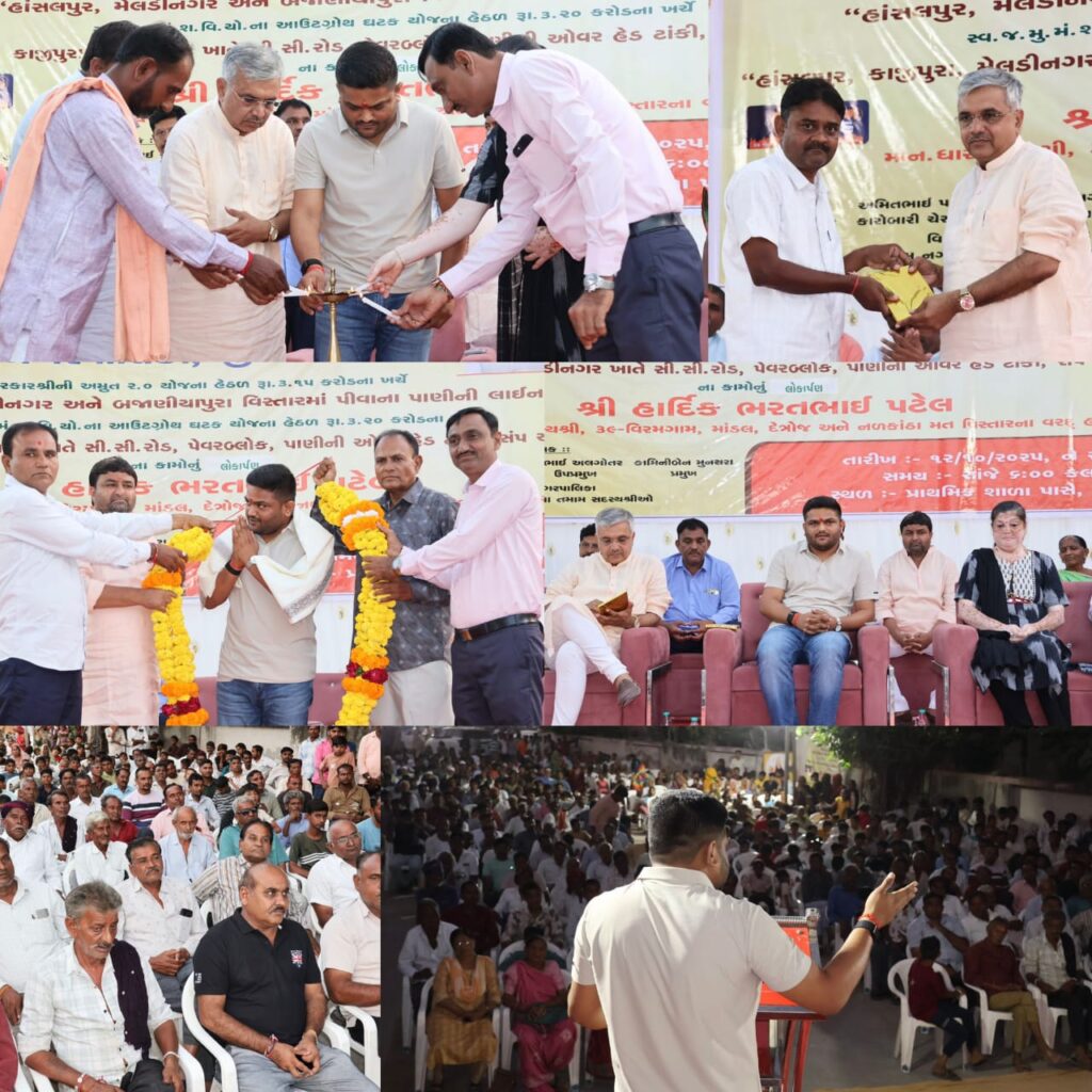 વિકાસ સપ્તાહ અંતર્ગત રવિવારે વિરમગામ શહેરના વોર્ડ નં:૯ માં ગુજરાત સરકારની અમૃત ૨.૦ યોજના હેઠળ મેલડીનગર અને હાંસલપુર વિસ્તારમાં ૩.૧૫ કરોડના ખર્ચે પીવાના પાણીની ૧૦ કિલોમીટર લાંબી પાઈપલાઈનના કામ અને ૩.૨૦ કરોડના ખર્ચે હાંસલપૂર, મેલડીનગર અને કાજીપુરા વિસ્તારમાં સીસી રોડ, પેવર બ્લોક, પાણીની ઓવરહેડ ટાંકી, સંપ અને સ્ટ્રીટ લાઈટના કામનું હાંસલપુર ગામમાં ધારાસભ્ય હાર્દિક પટેલના વરદ હસ્તે લોકાર્પણ કરવામાં આવ્યું