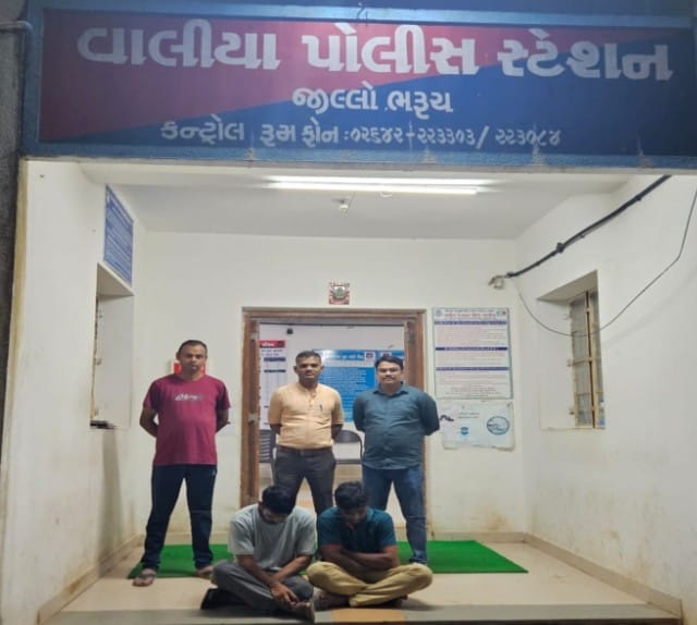 પોલીસ ઈન્સ્પેક્ટર એમ.બી. તોમરની સૂચનાના આધારે, વાલિયા પોલીસ સ્ટેશનની ટીમે પેટ્રોલિંગ દરમિયાન બાતમીના આધારે વાલિયાના હનુમાન ફળિયામાં દરોડો પાડ્યો હતો. આ દરોડામાં, બે ઈસમો ગેરકાયદેસર રીતે ગંજીપાના વડે પૈસાથી હારજીતનો જુગાર રમતા ઝડપાઈ ગયા હતા.