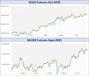સમીક્ષા હેઠળના સપ્તાહ દરમિયાન કીમતી ધાતુઓમાં સોના-ચાંદીના વાયદાઓમાં રૂ.133486.63 કરોડનાં કામકાજ થયાં હતાં. એમસીએક્સ સોનું ઓક્ટોબર વાયદો સપ્તાહના પ્રારંભે 10 ગ્રામદીઠ રૂ.101950ના ભાવે ખૂલી, સપ્તાહ દરમિયાન ઇન્ટ્રા-ડેમાં ઉપરમાં રૂ.102250 અને નીચામાં રૂ.99663ના મથાળે અથડાઈ, રૂ.101468ના આગલા બંધ સામે સપ્તાહના અંતે રૂ.1630 ઘટી રૂ.99838ના ભાવે બંધ થયો હતો. ગોલ્ડ-ગિની ઓગસ્ટ વાયદો 8 ગ્રામદીઠ રૂ.997 ઘટી સપ્તાહના અંતે રૂ.79965ના ભાવે બંધ થયો હતો. ગોલ્ડ-પેટલ ઓગસ્ટ વાયદો સપ્તાહના અંતે 1 ગ્રામદીઠ રૂ.118 ઘટી રૂ.10021ના ભાવે બંધ થયો હતો. સોનું-મિની સપ્ટેમ્બર વાયદો 10 ગ્રામદીઠ રૂ.1473 ઘટી રૂ.99362 થયો હતો. ગોલ્ડ-ટેન ઓગસ્ટ વાયદો સપ્તાહના પ્રારંભે 10 ગ્રામદીઠ રૂ.101152ના ભાવે ખૂલી, સપ્તાહ દરમિયાન ઇન્ટ્રા-ડેમાં ઉપરમાં રૂ.101703 અને નીચામાં રૂ.99315ના મથાળે અથડાઈ, રૂ.100944ના આગલા બંધ સામે સપ્તાહના અંતે રૂ.1449 ઘટી રૂ.99495 થયો હતો.