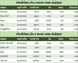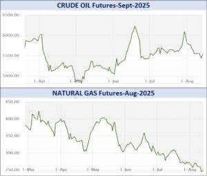 એનર્જી સેગમેન્ટમાં રૂ.32605.64 કરોડનાં કામકાજ થયાં હતાં. એમસીએક્સ ઇલેક્ટ્રિસિટી ઓગસ્ટ વાયદો સપ્તાહના પ્રારંભે એમડબલ્યુએચદીઠ રૂ.4459ના ભાવે ખૂલી, સપ્તાહ દરમિયાન ઇન્ટ્રા-ડેમાં ઉપરમાં રૂ.4460 અને નીચામાં રૂ.4419ના સ્તરને સ્પર્શી, સપ્તાહના અંતે રૂ.36 ઘટી રૂ.4423ના સ્તરે બંધ થયો હતો. ક્રૂડ તેલ સપ્ટેમ્બર વાયદો સપ્તાહના પ્રારંભે બેરલદીઠ રૂ.5550ના ભાવે ખૂલી, સપ્તાહ દરમિયાન ઇન્ટ્રા-ડેમાં ઉપરમાં રૂ.5601 અને નીચામાં રૂ.5389ના સ્તરને સ્પર્શી, રૂ.5547ના આગલા બંધ સામે સપ્તાહના અંતે રૂ.10 ઘટી રૂ.5537ના ભાવે બંધ થયો હતો. ક્રૂડ તેલ-મિની સપ્ટેમ્બર વાયદો સપ્તાહના અંતે રૂ.12 ઘટી રૂ.5538 થયો હતો. નેચરલ ગેસ ઓગસ્ટ વાયદો એમએમબીટીયુદીઠ રૂ.20.4 ઘટી સપ્તાહના અંતે રૂ.248.3 થયો હતો. નેચરલ ગેસ-મિની ઓગસ્ટ વાયદો સપ્તાહના અંતે રૂ.20.4 ઘટી રૂ.248.3ના સ્તરે બંધ થયો હતો.