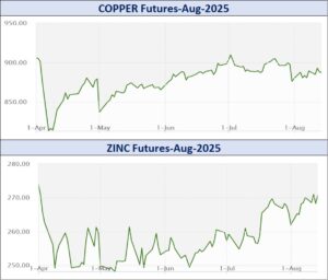 બિનલોહ ધાતુઓમાં રૂ.8642.41 કરોડનાં કામકાજ થયાં હતાં. સપ્તાહના અંતે કિલોદીઠ તાંબું ઓગસ્ટ વાયદો રૂ.6.65 વધી રૂ.887.4ના સ્તરે બંધ થયો હતો. જસત ઓગસ્ટ વાયદો સપ્તાહના અંતે રૂ.2.15 વધી રૂ.270.65 થયો હતો. એલ્યુમિનિયમ ઓગસ્ટ વાયદો રૂ.1.85 વધી સપ્તાહના અંતે રૂ.254.9ના ભાવે બંધ થયો હતો. સીસું ઓગસ્ટ વાયદો 95 પૈસા ઘટી રૂ.180.2ના ભાવે સપ્તાહના અંતે બંધ થયો હતો.