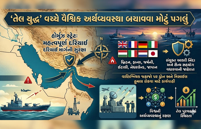 મિડલ ઈસ્ટમાં ચાલી રહેલા ‘તેલ યુદ્ધ’ વચ્ચે વિશ્વની અર્થવ્યવસ્થાને બચાવવા માટે એક મોટું પગલું ભરવામાં આવ્યું છે. બ્રિટન, ફ્રાન્સ, જર્મની, ઈટાલી, નેધરલેન્ડ અને જાપાને સંયુક્ત રીતે ઈરાની હુમલાઓની આકરી નિંદા કરી છે. આ દેશોએ હોર્મુઝ સ્ટ્રેટ જેવા મહત્વપૂર્ણ દરિયાઈ માર્ગ પર સૈન્ય સહયોગ વધારવાની જાહેરાત કરી છે, જેથી વાણિજ્યિક જહાજો પર થઈ રહેલા ડ્રોન અને મિસાઈલ હુમલાઓને રોકી શકાય.