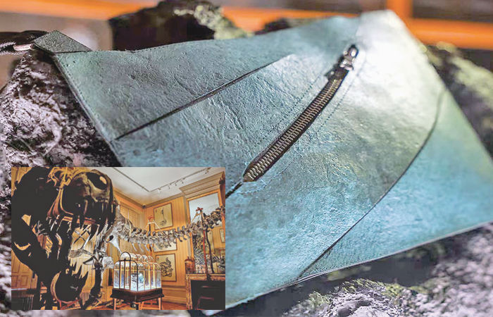 મ્યૂઝિયમમાં એક પાંજરામાં પથ્થર પર આ બેગને મુકવામાં આવી છે. ૧૧મી મે સુધી આ બેગને પ્રદર્શનીમાં રાખવામાં આવશે. જોકે આ બેગ સંપૂર્ણપણે ડાયનાસોરના ચામડામાંથી બનાવવામાં નથી આવી પરંતુ ડાયનાસોરના જે અંશો મળી આવ્યા હતા તેનો ઉપયોગ કરીને ચામડાનો લેબમાં વિકાસ કરવામાં આવ્યો હતો, વૈજ્ઞાાનિકોએ ટી-એક્સના જીવાશ્મોમાં બહુ જ જુના પ્રોટિનના નાના ટુકડા કર્યા હતા, આ ટુકડાને જેનેટિક એન્જિનિયરિંગની મદદથી એક અજ્ઞાાત પશુની કોશિકામાં નાખ્યું હતું, જેનાથી અંતે કોલેજન પ્રોટિન તૈયાર કરાયું હતું, જે બાદમાં ચામડામાં ફેરવાઇ ગયું હતું.ધ ઓર્ગેનાઇઝ્ડ કંપનીના સીઇઓ થોમસ મિશેલે જણાવ્યું હતું કે આ પ્રોજેક્ટમાં અનેક ટેક્નીકલ પડકારોનો સામનો કરવો પડયો હતો. ટાયરેનોસોરસ રેક્સ નામના ડાયનાસોરના અવશેષોની મદદથી આ વિશેષ બેગ તૈયાર કરવામાં આવી છે. હાડકાની અંદર જે કોલેજન મળી આવે છે. જ્યારે કોઇ નવું સાહસ પ્રથમ વખત કરવામાં આવે ત્યારે તેની ટીકા થાય તે પણ સ્વાભાવીક છે. આ બેગ માટે ચામડુ કેવી રીતે તૈયાર થયું તેને લઇને પણ કેટલાક અહેવાલ સામે આવ્યા છે. જે મુજબ ડાયનાસોરના હાડકામાંથી જે અવશેષો મળી આવ્યા બાદમાં તેને કોઇ અજાણ્યા પશુના સેલમાં નાખવામાં આવ્યા જેનાથી બાદમાં કોલેજન તૈયાર કરવામાં આવ્યું. જેને બાદમાં ચામડામાં ફેરવી નાખવામાં આવ્યું, એટલે નિષ્ણાતોનો દાવો છે કે આ પર્સ મૂળતો ડાયનાસોરના ચામડામાંથી જ તૈયાર થયું કહેવાય.