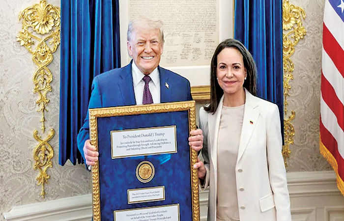 વેનેઝુએલાની વિપક્ષની નેતા મારિયા કોરિના મચાડોએ તેને મળેલું નોબેલ પીસ પ્રાઇઝ અમેરિકન પ્રમુખ ડોનાલ્ડ ટ્રમ્પને આપ્યું હતું. ટ્રમ્પે તેને પારસ્પરિક સન્માનની સુંદર અભિવ્યક્તિ ગણાવી હતી. જો કે નોબેલ પીસ પ્રાઇઝ કમિટીએ વિરોધ કરતાં જણાવ્યું હતું કે આ રીતે કોઈ તેમનું ઇનામ બીજાને ન આપી શકે. મચાડો પહેલા ઘણી વખત કહી ચૂકી છે કે તે ટ્રમ્પને તેનું નોબેલ પીસ પ્રાઇઝ આપશે.