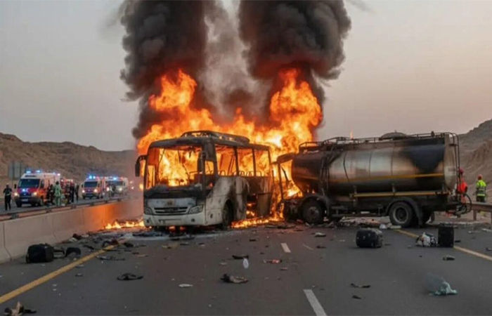 સાઉદી અરબિમાં મક્કાથી મદીના જઈ રહેલી બસ ડીઝલ ટેન્કર સાથે અથડાતા સર્જોયેલી દુર્ઘટનામાં ૨૦ મહિલાઓ અને ૧૧બાળકો તથા બે સાઉદી નાગરિકો સહિત  સહિત ૪૫ ભારતીયોના મોત થયા છે. બસમાં કુલ ૫૪ મુસાફરો સવાર હતા. ફક્ત એક જ વ્યક્તિ જીવિત બચ્યો હોવાનું કહેવાય છે. મૃત્યુ પામેલા ભારતીયો તેલંગણાના રહેવાસી હતા.   વડાપ્રધાન નરેન્દ્ર મોદી અને વિદેશપ્રધાન એસ જયશંકરે આ ઘટના અંગે તરત જ દિલસોજી વ્યક્ત કરી હતી.